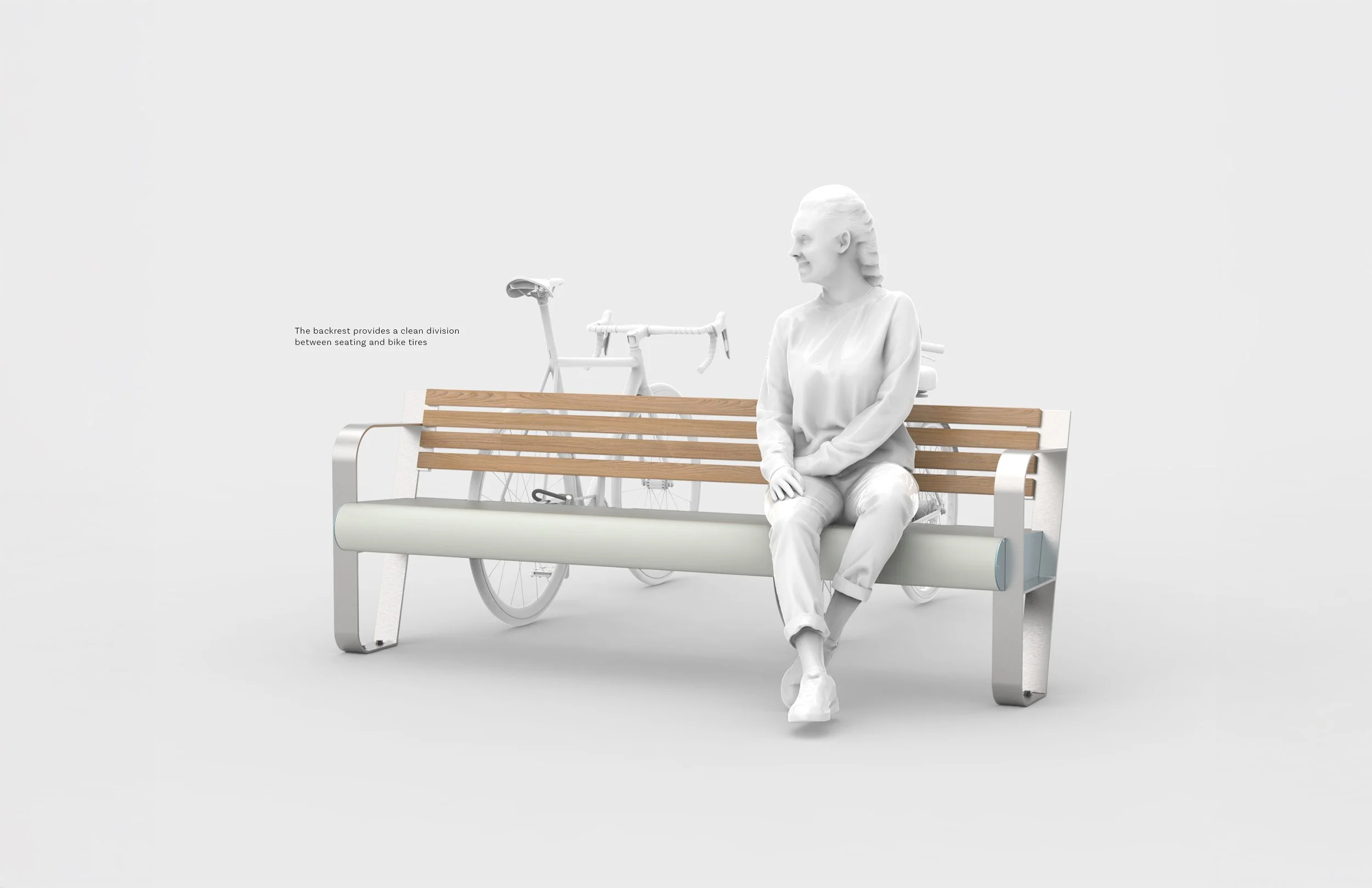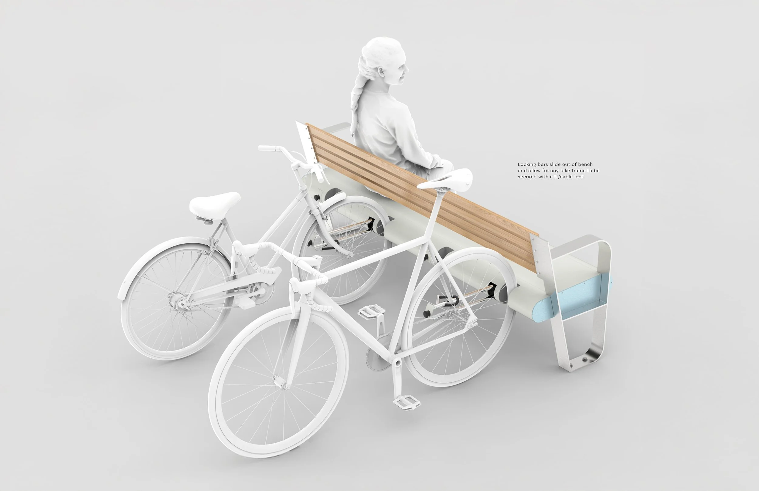 To address these problems I’ve designed an elegant multi-use public furniture/bike parking solution that engages a range of users, and when not in use by cyclists sacrifices no extra space.
